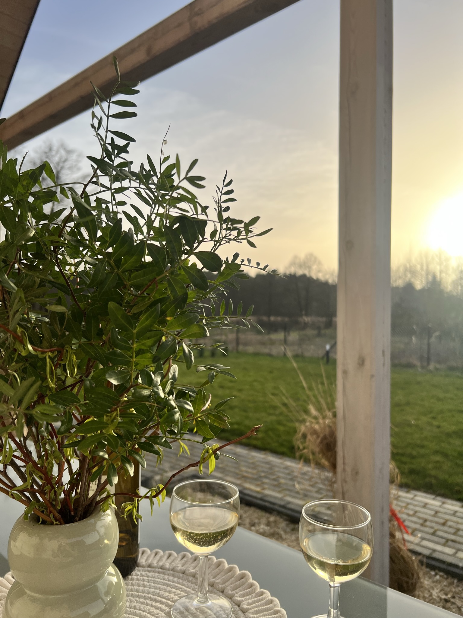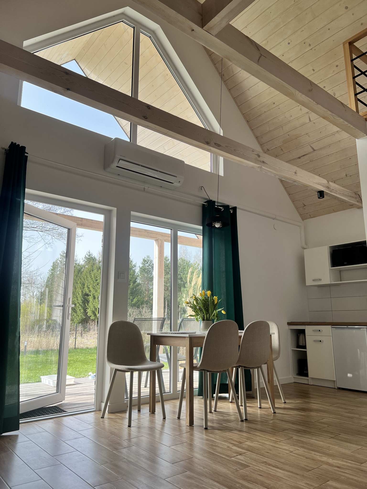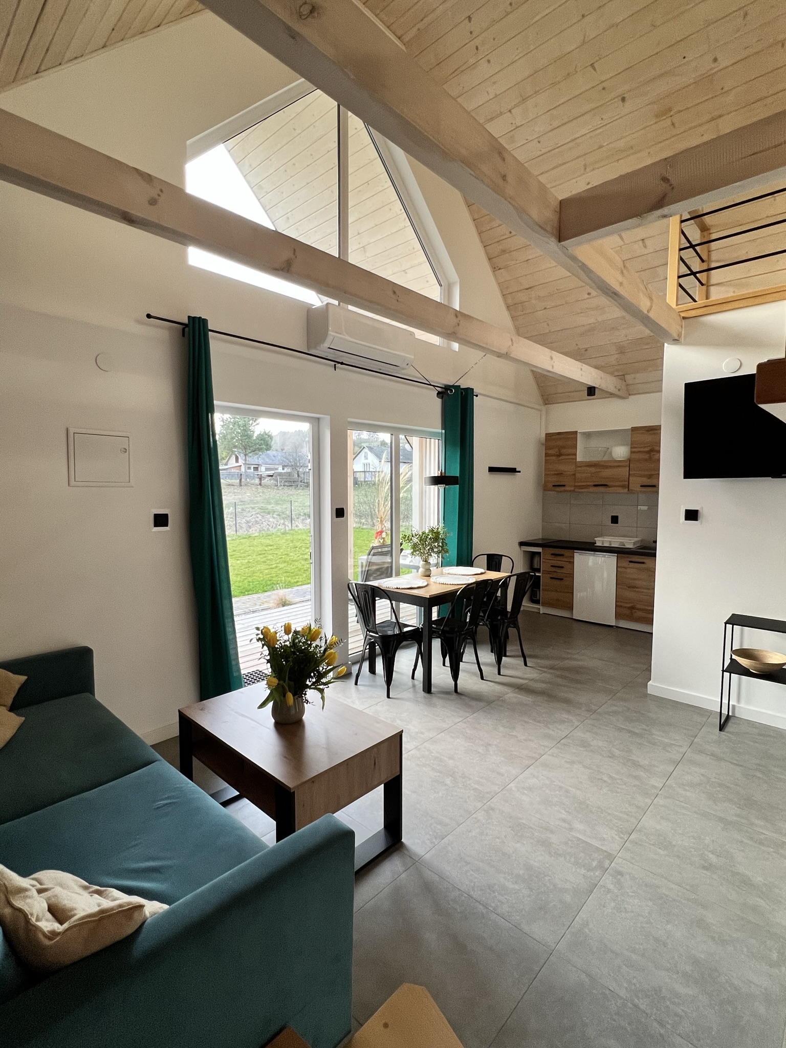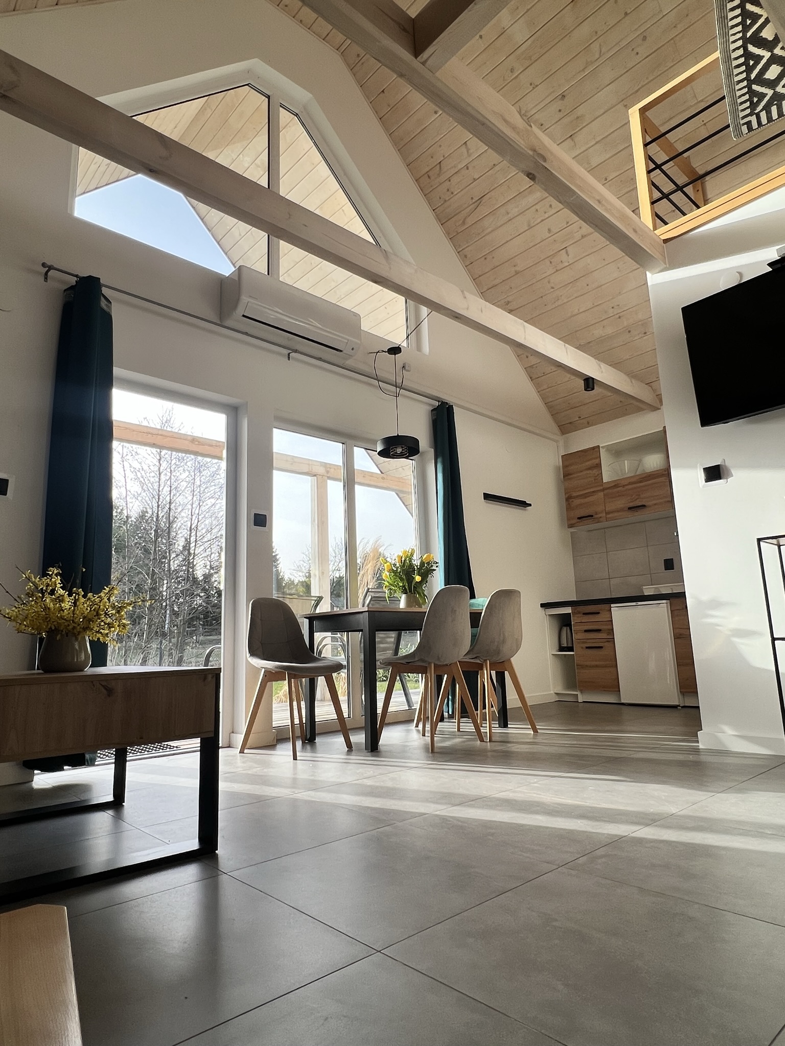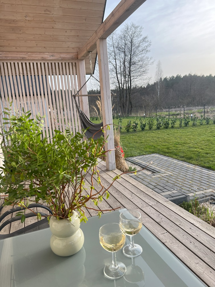W każdym domku znajduje się otwarty i przestronny salon o wysokości 6 metrów. Dzięki temu jest on bardzo dobrze doświetlony i daje poczucie większej przestrzenności. Znajduje się w nim wygodna rozkładana sofa oraz stolik kawowy, duży 50 cal TV wraz z dostępem do telewizji satelitarnej oraz Wi-fi. W kuchni znajdziesz lodówkę z zamrażarką, płytę indukcyjną, talerze i kubki, kieliszki, sztućce, garnki, patelnie. Przy dużym oknie w części jadalnianej znalazło się miejsce na stół i krzesła, w której będziesz mógł zjeść przygotowane posiłki. A jeśli tylko będziesz chciał zjeść posiłek “na zewnątrz” wówczas możesz skorzystać z dużego tarasu, który znajduje się przy każdym domku i jest w pełni wyposażony w wygodne meble ogrodowe (krzesła, stół oraz wiszący hamak w stylu krzesła brazylijskiego) oraz grill.